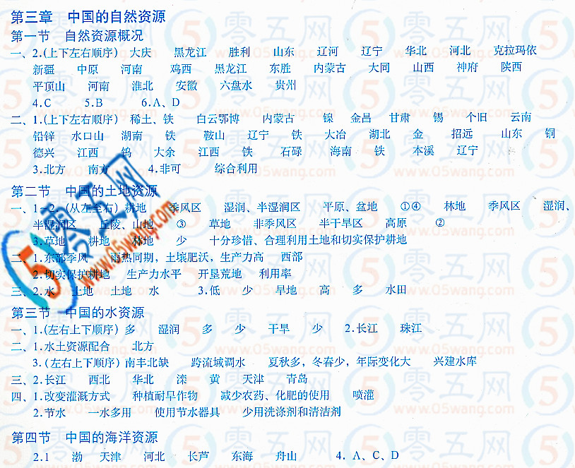 第三章中國的自然資源地理填充圖冊(cè)答案