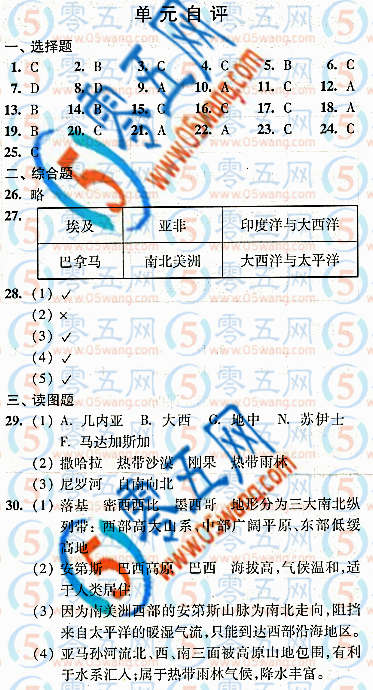第一章認(rèn)識(shí)大洲單元自評(píng)同步練習(xí)答案