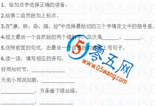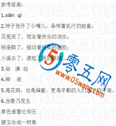 絲絲春雨,哺育著剛剛蘇醒的大地。 種子張開了小嘴兒 品味著乳汁的甜蜜 花苞笑了 飽含著快樂的淚水 柳條醉了 搖動(dòng)著纖( qiàn xiān)柔的腰肢 小溪樂了 漾起了笑的漣漪 春雨是彩色的,()紅了桃花,()白了柳絮,()青了山峰,()綠了秧畦(qí w?。?。 春雨是香甜的,你可聞到稻麥瓜果成熟的氣息? 小草說(shuō),春雨是仙女撒下的花辮;蝴蝶說(shuō),春雨是天上落下的蜂密;孩子們說(shuō)______________________......