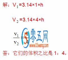 有兩個(gè)圓柱形容積,它們的高相等,底面半徑的比是1:2。它們的體積之比是幾比幾?