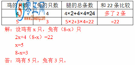 雞和兔一共有8只,它們的腿有22條。雞和兔各有多少只?