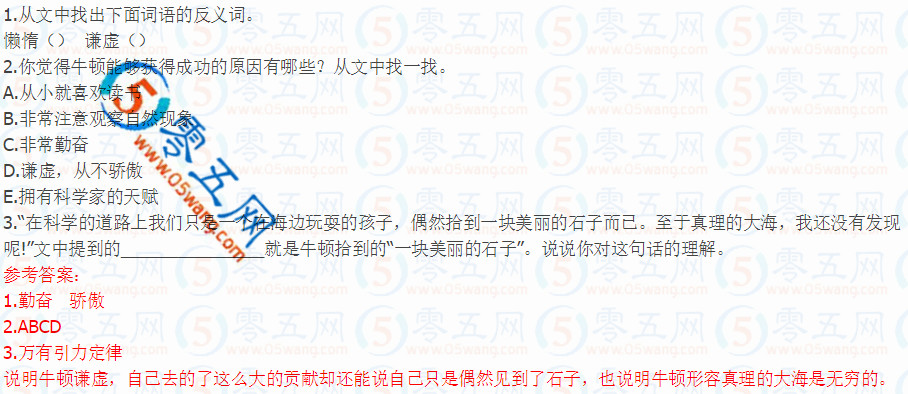 牛頓是位偉大的科學(xué)家,他為自然科學(xué)的發(fā)展作出了巨大貢獻(xiàn)。1643年,牛頓生于英國(guó)東南部林肯郡的一個(gè)農(nóng)村。他從小就喜歡讀書,非常勤奮,還特別喜歡手工。18歲那年,牛頓進(jìn)入劍橋大學(xué)。26歲,就成為劍橋大學(xué)著名的數(shù)學(xué)教授。 年輕的時(shí)候,牛頓就非常注意觀察自然現(xiàn)象。據(jù)說有一天傍晚,牛頓在蘋果樹下乘涼,忽然有一個(gè)蘋果從樹上掉下來。牛頓就覺得很奇怪,蘋果為什么掉在地下,而不向天上飛去呢?經(jīng)過專心思考和研究,后來牛頓發(fā)現(xiàn)了萬(wàn)有引力定律。 牛頓非常勤奮,他一生中的絕大部分時(shí)間是在實(shí)驗(yàn)室度過的,他常通宵達(dá)旦地做實(shí)驗(yàn),有時(shí)一選六個(gè)星期都在實(shí)驗(yàn)室工作。 牛頓雖然是位偉大的科學(xué)家,卻從來沒有驕傲自滿過。他謙虛地說:在科學(xué)的道路上我們只是一個(gè)在海邊玩耍的孩子,偶然拾到一塊美麗的石子而已。至于真理的大海,我還沒有發(fā)現(xiàn)呢! 1727年,牛頓病逝于倫敦郊區(qū)。英國(guó)政府為他舉行了隆重的國(guó)葬。