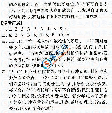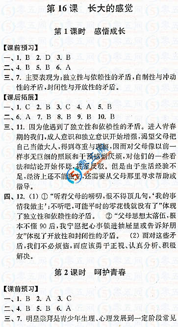 蘇人版七下思想品德第16課長大的感覺同步練習(xí)答案