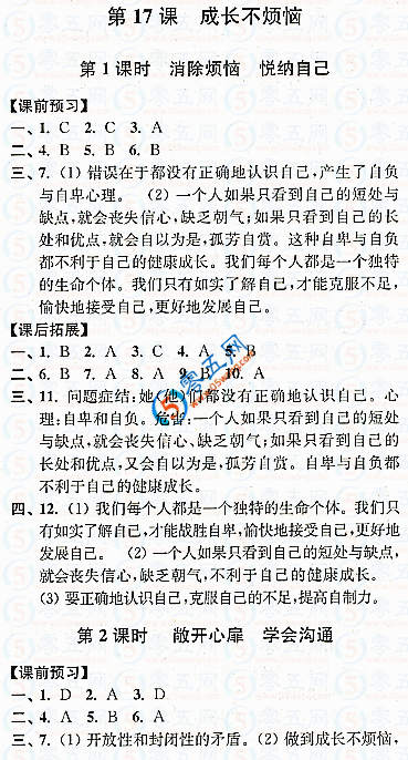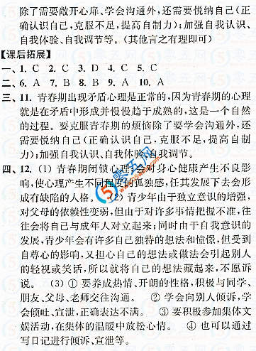 蘇人版七下思想品德第17課成長不煩惱同步練習答案