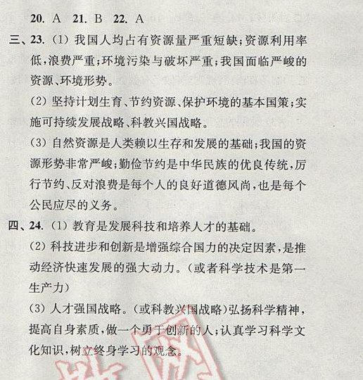 蘇人版八下思想品德第20課保護我們共有的家園同步練習答案