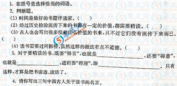 古今中外,積累起來的書真是多極了,但是(浩浩蕩蕩 浩如煙海)。但是,書雖多,真正值得精讀的并不多。 怎樣知道哪些書是值得精讀的呢?對子這一個問題不必發(fā)愁。自古以來,已經(jīng)有一位最(公正 公開)的評選家,有許多推薦者向它推薦好書。這個評選家就是時間,這些推薦者就是群眾。歷來的群眾,把他們認(rèn)為有價值的書,推薦給時間。時間照著他們的推薦,將那些沒有永久價值的書都刷下去了,那些有永久價值的書都是經(jīng)過時間(檢查 考驗)流傳下來。這一類的書都是應(yīng)該精讀的書。當(dāng)然隨著時間的推移和歷史的發(fā)展,這些書之中還要有些被刷下去。不過直到現(xiàn)在為止,它們都是榜上有名的,我們只能看現(xiàn)在的榜。 我們心里先有了這個數(shù),就可隨著自己的專業(yè)選定一些須要精讀的書。讀的時候先要解其言。這就是說,首先要懂得它的文字,它的文字就是它的語言。語言有中外之分,也有古今之別,這叫語言文字關(guān)。攻不破這道關(guān),不知道關(guān)里邊是些什么東西,只在關(guān)外指手畫腳,那是不行的。當(dāng)然要攻這道關(guān)的時候,要先作許多準(zhǔn)備,用許多工具,如字典和詞典等工具書之類。中國有句老話說是“書不盡言,言不盡意”,讀書的時候,即使書中的字都認(rèn)得了,話全懂了,還(未必 必然)能知道作書的人的意思。從前人說,讀書要注意字里行間,又說讀詩要得其“弦外音,味外味”。這都是說要在文字以外體會它的精神實質(zhì)。這就是知其意?!耙狻彪x不開語言文字,但有些是文字所不能完全表達(dá)出來的。如果只局限于語言文字,死抓住語言文字不放,那就成為死讀書了。語言文字是幫助了解書的意思的拐棍。既然知道了那個意思,最好扔了拐棍。這就是古人所說的“得意忘言”。在人與人的關(guān)系中,過河拆橋是不道德的事。但是,在讀書中,就是要過河拆橋。 上面所說的“書不盡言”“言不盡意”之下,還要加一句“意不盡理”。理是客觀的道理;意是著書的人的主觀的認(rèn)識和判斷,也就是客觀的道理在他的主觀上的反映。理和意既然有主觀客觀之分,意和理就不能完全相合。人總是人,不是全知全能。他的主觀上的反映、體會和判斷,和客觀的道理總要有一定的差距。所以讀書僅知其意還不行,還要明其理,才不至于為前人的意所誤。如果明其理了,我就有我自己的意。我的意當(dāng)然也是主觀的,也可能不完全合乎客觀的理。但我可以把我的意和前人的意互相比較,互相補充,互相糾正。這就可能有一個比較正確的意。這個意是我的,我就可以用它處理事務(wù),解決問題。讀書到這個程度就算是能活學(xué)活用,把書讀活了。