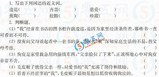 參考答案: 1.徘徊 小氣 慈祥 陶冶 狡猾 收藏 2.⑴x ⑵√ ⑶x ⑷√ ⑸√ 3.①爸爸竟然會忍心把家里最珍貴的狗皮拿出去賣,我知道父親一定很舍不得。今后我要更努力為父母爭光……… ②孩子,你那么努力地讀書,真難得。如果我不幫你,我這一生都不好過……為了你的前途,為了你今后不要成為像我這樣的人,我就幫你一把!希望你不要辜負(fù)我的期望…… 4.讀完這本書,作者不僅僅會認(rèn)為只是一本書,還是一個值得回憶的記憶貝殼。里面還珍藏著父親對他的愛和狗皮販子對他的關(guān)心。這么珍貴的事情似乎藏在這本書里一樣,感覺永遠(yuǎn)是那么沉重,永遠(yuǎn)是那么珍貴……… |