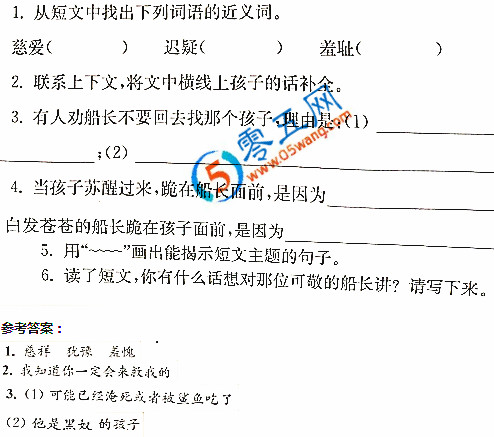 一艘貨輪在煙波浩渺的大西洋上行駛。一個(gè)在船尾做勤雜的黑人小孩不慎掉進(jìn)了波濤滾滾的大西洋。孩子大喊救命,無(wú)奈風(fēng)大浪急,船上的人誰(shuí)也沒(méi)聽(tīng)見(jiàn),他眼睜睜地看著貨輪越來(lái)越遠(yuǎn)…… 求生的本能使孩子在冰冷的海水里拼命地游,他用全身的力氣揮動(dòng)著瘦小的雙臂,努力把頭探出水面,睜大眼睛盯著輪船遠(yuǎn)去的方向。船越走越遠(yuǎn),船身越來(lái)越小,到后來(lái),什么都看不見(jiàn)了,只剩下一望無(wú)際的汪洋。孩子的力氣也快用完了,實(shí)在游不動(dòng)了,他覺(jué)得自己要沉下去了。放棄吧,他對(duì)自己說(shuō)。這時(shí)候,他想起了老船長(zhǎng)那慈祥的臉和友善的眼神。不,船長(zhǎng)知道我掉到海里后,一定會(huì)來(lái)救我的!想到這里,孩子鼓足勇氣用最后的力氣又朝前游去…… 船長(zhǎng)終于發(fā)現(xiàn)那個(gè)黑人孩子失蹤了,當(dāng)他斷定孩子是掉進(jìn)海里后,便下令返航。這時(shí),有人規(guī)勸:“這么長(zhǎng)時(shí)間了,,就是沒(méi)有被淹沒(méi),也讓鯊魚(yú)吃了……”船長(zhǎng)猶豫了一下,還是決定回去找。又有人說(shuō):“為了一個(gè)黑奴孩子,值得嗎?”船長(zhǎng)大喝一聲:“住嘴!” 終于,在那孩子就要沉下去的最后一刻,船長(zhǎng)趕到了,救起了孩子。 當(dāng)孩子蘇醒后,跪在地上感謝船長(zhǎng)的救命之恩時(shí),船長(zhǎng)扶起孩子問(wèn):“孩子,你怎么能堅(jiān)持這么長(zhǎng)時(shí)間?” 孩子回答:“_________________________________” “你怎么知道我一定會(huì)來(lái)救你?” “因?yàn)槲抑滥悄菢拥娜?!?nbsp; 聽(tīng)到這里,白發(fā)蒼蒼的船長(zhǎng)“撲通”一聲跪在孩子面前,淚流滿面:“孩子,不是我救了你,而是你救了我啊!我為我在那一刻的猶豫而感到恥辱……” 一個(gè)人能被他人相信也是一種幸福。他人在絕望時(shí)想起你,相信你會(huì)給予拯救更是一種幸福。