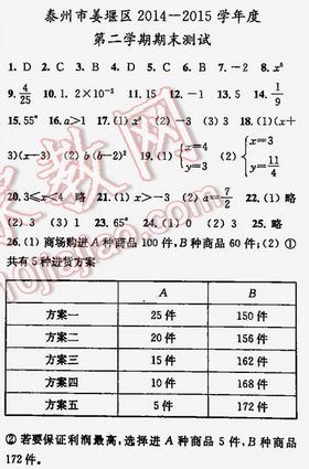 【亮點給力作業(yè)本七年級數(shù)學(xué)下冊江蘇版】泰州市姜堰區(qū)
