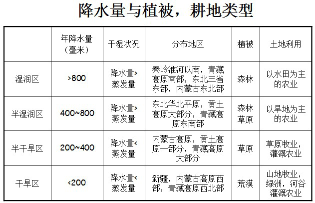 根據(jù)降水量與蒸發(fā)量的對比關(guān)系,我國可以劃分為四個干濕區(qū):濕潤地區(qū),半濕潤地區(qū),半旱地區(qū),干旱地區(qū)。