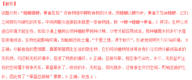 A.“螳螂捕蟬,黃雀在后”該食物鏈可以表示為“蟬→螳螂→黃雀”