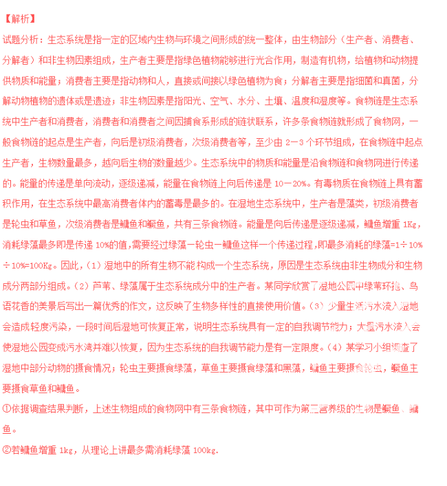 【答案】(1)不能 生態(tài)系統(tǒng)由非生物成分和生物成分兩部分組成 (2)生產(chǎn)者 直接 (3)自我調(diào)節(jié) 自我調(diào)節(jié)能力是有一定限度 (4)①三 鱖魚、鳙魚 ②100