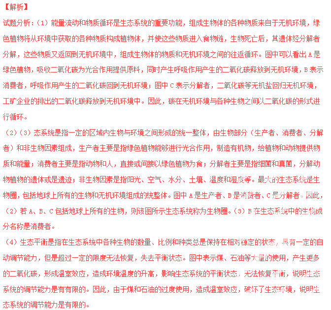 (4)由于煤和石油的過度使用,造成溫室效應(yīng),破壞了生態(tài)環(huán)境,說明生態(tài)系統(tǒng)的 能力是有限的。