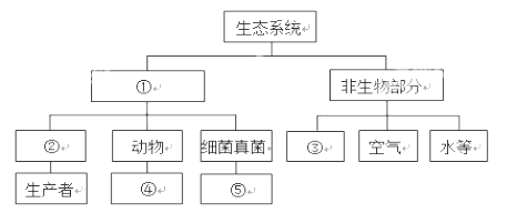【答案】①生物部分 ②植物 ③陽光、土壤、溫度等 ④消費(fèi)者 ⑤分解者