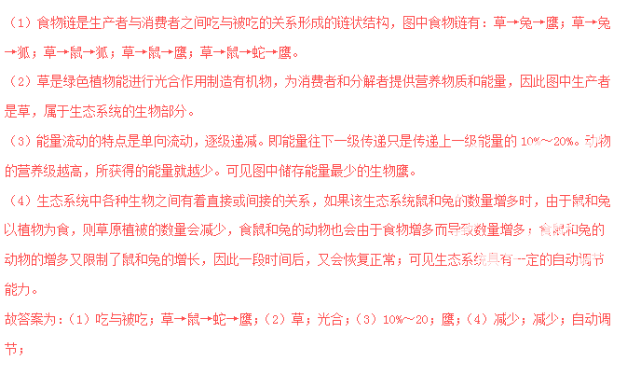 【答案】(1)吃與被吃;草→鼠→蛇→鷹;(2)草;光合;(3)10%~20;鷹;(4)減少;減少;自動(dòng)調(diào)節(jié);