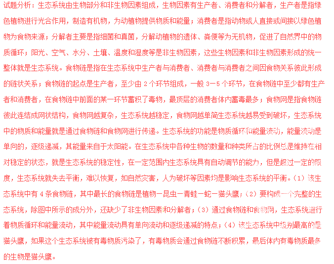 (4)如果這個(gè)生態(tài)系統(tǒng)被有毒物質(zhì)污染了,有毒物質(zhì)會(huì)通過食物鏈不斷積累,最后體內(nèi)有毒物質(zhì)最多的生物是 。(1分)