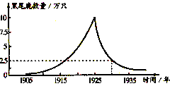 19.【2015年福建省武中考模擬】下圖是凱巴森林中黑尾鹿數(shù)量動(dòng)態(tài)曲線圖。為了保護(hù)黑尾鹿,1906年,人們開始捕殺以黑尾鹿為食的狼,結(jié)果黑尾鹿種群的變化如圖所示。