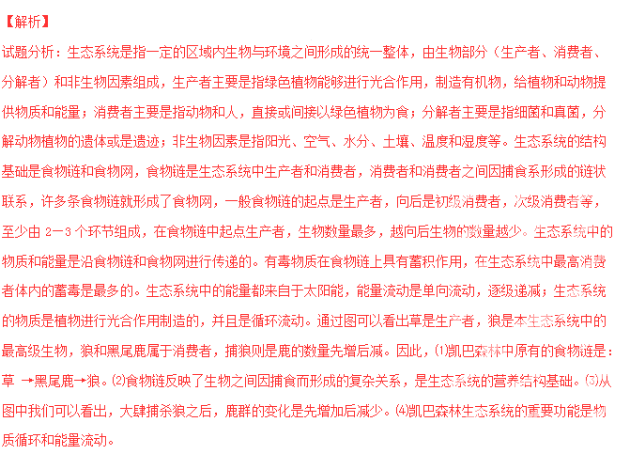 【答案】⑴草 →黑尾鹿→狼 ⑵ 營(yíng)養(yǎng)結(jié)構(gòu) ⑶ 先增加后減少 ⑷ 能量流動(dòng)
