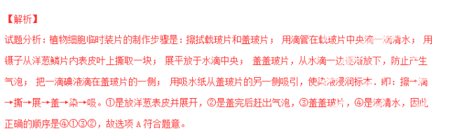 【點睛】本題考查植物細胞臨時裝片的制作步驟,以及注意事項,重點在于對操作圖的理解。