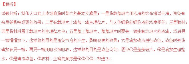 【例7】【2015年中考山東省濱州市】下圖是制作人體口腔上皮細胞臨時裝片的過程,其正確順序是( )