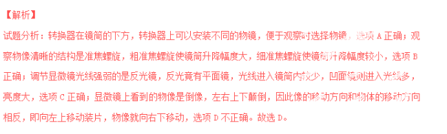 試題分析:準焦螺旋:鏡臂上裝有兩種可以轉(zhuǎn)動的螺旋,能使鏡筒上升或下降,稱為準焦螺旋。大的螺旋轉(zhuǎn)動一圈。鏡筒升降10毫米,用于調(diào)節(jié)低倍鏡,叫做粗準焦螺旋。小的螺旋圍動一圈,鏡筒升降0.1毫米.主要用于調(diào)節(jié)高倍鏡,叫做細準焦螺旋。故A正確;光線強時,用小光圈、平面鏡調(diào)節(jié);光線弱時,用大光圈、凹面鏡調(diào)節(jié),故B錯誤;file:///C:/Users/QINGXI~1/AppData/Local/Temp/ksohtml/wps8952.tmp.jpg在觀察物像時,物像移動的方向與標本移動的方向是相反的,所以把視野中位于右上方的物像移動正中央的話,玻片標本應(yīng)往右上方移動。故C正確;顯微鏡的放大倍數(shù)越大所觀察到的范圍越小,觀察到的細胞數(shù)目就越少,細胞體積就越大;反之,微鏡的放大倍數(shù)越小所觀察到的范圍越大,觀察到的細胞數(shù)目就越多,細胞體積就越小,故D正確。故A、C、D正確, B錯誤,故選B。