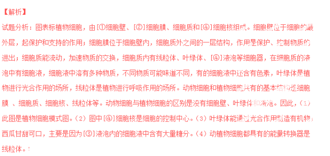 (3)葉綠體能通過 作用制造有機(jī)物;西瓜甘甜可口,主要是因?yàn)閇③] 內(nèi)的細(xì)胞液中含有大量糖分。