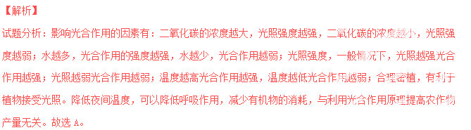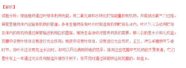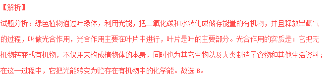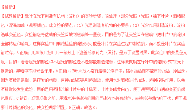 2016年中考生物考點總動員系列【專題03】光合作用(1) 聚焦考點☆溫習理解 一、探究實驗:綠葉在光下制造有機物 1、實驗的步驟: (1)把盆栽的天竺葵放到黑暗處一晝夜,目的是讓淀粉運走耗盡。 (2)用file:///C:/Users/QINGXI~1/AppData/Local/Temp/ksohtml/wpsEE0F.tmp.jpg黑紙片把葉片的一部分從上下兩面遮蓋起來,另一部分不遮光,形成對照實驗,然后移到陽光下照射。 (3)幾個小時后,摘下葉片,去掉遮光的紙片。 (4)把葉片放入盛有酒精的小燒杯中,隔水加熱,使葉片含有的葉綠素溶解到酒精中,葉片變成黃白色。 (5)用清水漂file:///C:/Users/QINGXI~1/AppData/Local/Temp/ksohtml/wpsEE1F.tmp.jpg洗葉片,再把葉片放到培養(yǎng)皿里,向葉片滴加碘液。 (6)稍停片刻,用清水沖掉碘液,觀察葉片的變化。 2.結論:葉片的見光部分遇到碘液變成了藍色,實際是淀粉遇碘液變藍,說明葉片的見光部分產(chǎn)生了有機物——淀粉。 二、光合作用的概念 1光合作用的概念:綠色植物通過 葉綠體利用 光能,將 二氧化碳和 水轉(zhuǎn)化貯存能量的 有機物,并且釋放出 氧氣的過程。2、光合作用的反應式:  葉片見光部分遇到典液變藍,說明葉片的見光部分產(chǎn)生了有機物——淀粉3、光合作用的條件:光和葉綠體是不可缺少的條件,其中光能供給能量,葉綠體提供光合作用的場所。 三.光合作用的實質(zhì):制造有機物,貯存能量??梢愿爬ǔ鰞蓚€方面:一方面把簡單的無機物轉(zhuǎn)化成復雜的有機物,并且釋放出氧氣,這是物質(zhì)的轉(zhuǎn)化過程;另一方面是在把無機物轉(zhuǎn)化成有機物的同時,把光能轉(zhuǎn)變成為儲存在有機物中的化學能,這是能量的轉(zhuǎn)化過程。 四、光合作用的意義:光合作用是一切生物生存、繁衍和發(fā)展的根本保障。綠色植物通過光合作用制造的有機物不僅能滿足自身生長、發(fā)育和繁殖的需要,而file:///C:/Users/QINGXI~1/AppData/Local/Temp/ksohtml/wps1342.tmp.jpg且為生物圈中的其他生物提供了基本的食物來源,其產(chǎn)生的氧氣是生物圈的氧氣的來源。 五、光合作用的應用 A.合理密植。合理密植既充分利用了單位面積上的光照而避免造成浪費,又不至于讓葉片相互遮擋,影響光合作用的進行。B.間作套種(立體種植)。立體種植就是把兩種或兩種以上的作物,在空間和時間上進行最優(yōu)化組合,以達到增產(chǎn),增收,延長應的目的。C.增加二氧化碳的濃度。二氧化碳是植物進行光合作用的主要原料,空氣中二氧化碳濃度一般是0.03%,當空氣中二氧化碳的濃度為0.5%~0.6%時,農(nóng)作物的光合作用就會顯著增強.產(chǎn)量有較大的提高。 六、影響光合作用的因素 1.光照強度:光照增強,光合作用隨之加強。但光照增強到一定程度后.光合作用不再加強。夏季中午,由于氣孔關閉,影響二氧化碳的進入,光合作用強度反而下降,因而中午光照最強的時候,并不是光合作削最強的時候。2.一氧化碳濃度:二氧化碳是光合作用的原料,其濃度影響光合作用的強度。溫室種植蔬可適當提高大棚內(nèi)二氧化碳的濃度,以提高產(chǎn)量。 3.溫度:植物在10℃~35℃、條件下正常進行光合作用,其中25℃~30℃最適宜,35℃以上光合作用強度開始下降,甚至停止。影響光合作用的外界條件主要是光照強度和二氧化碳濃度,在一定限度內(nèi),光照越強,光合作用越強;若光照過強,氣孔會關閉,從而影響光合作用的進行。 七、葉片的file:///C:/Users/QINGXI~1/AppData/Local/Temp/ksohtml/wps1353.tmp.jpg結構和功能 1、葉片的結構和功能 A.表皮:為葉片表面的一層初生保護組織,分為上、下表皮,表皮細胞扁平,排列緊密,外壁有一層角質(zhì)層,保護葉片不受病菌侵害,防止水分散失,通常不含葉綠體;在表皮分布有氣孔,氣孔由兩個半月形的保衛(wèi)細胞組成,可以張開或關閉,是植物蒸騰失水的“門戶”,也是氣體交換的“窗口”;保衛(wèi)細胞控制氣孔開閉。 B. 葉肉:由葉肉細胞構成,通常有下列兩種。柵欄組織:細file:///C:/Users/QINGXI~1/AppData/Local/Temp/ksohtml/wpsA762.tmp.jpg胞通常1至數(shù)層,長圓柱狀,垂直于表皮細胞,并緊密排列呈柵狀,內(nèi)含較多的葉綠體。海綿組織:細胞形狀多不規(guī)則,內(nèi)含較少的葉綠體,位于柵欄組織下方,層次不清,排列疏松,狀如海綿。C.葉脈:為貫穿于葉肉間的維管束。其中有導管和篩管,導管運輸水分和無機鹽,篩管運輸有機物。葉脈的功能是具有支持和輸導。 2.特別提醒:A.葉片上面的綠色比下面的深,這是因為接近上表皮的柵欄組織比接近下表皮的海綿組織含葉綠體多。 B.柵欄組織比海綿組織細胞排列緊密,所以自然落下的樹葉大都正面向下。C.從氣孔進出葉片的氣體主要是水蒸氣、二氧化碳、氧氣。 D.一般陸生植物葉的下表皮上的氣孔比上表皮多。 E.構成氣孔的保衛(wèi)細胞與表皮細胞的最大區(qū)別是:保衛(wèi)細胞內(nèi)含有葉綠體。 名師點睛☆典例分類 類型一:探究綠葉在光下制造有機物 【例1】【2015屆福建省龍巖市中考生物試卷】關于“驗證綠葉在光下合成淀粉”實驗的做法,不正確的是 A. 將盆栽天竺葵置于暗處2~3天 B. 用不透光紙將一健壯葉片的一部分上下遮蓋 C. 去除不透光紙片并將葉片放在盛有酒精的小燒杯中直接加熱 D. 葉片脫色漂洗后滴加碘液,觀察葉片顏色的變化 【答案】C 點:探究綠葉在光下合成淀粉。 【點睛】本題考查考查綠葉在光下合成淀粉的實驗,注意實驗步驟的操作,對照實驗的設
