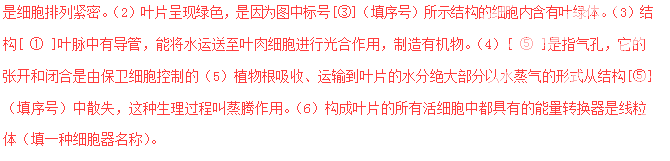 (2)葉片呈現(xiàn)綠色,是因?yàn)閳D中標(biāo)號(hào)[ ](填序號(hào))所示結(jié)構(gòu)的細(xì)胞內(nèi)含有葉綠體。