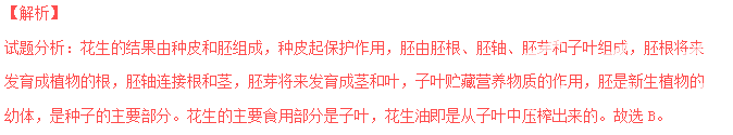 11.【2015年甘肅省武威市初中畢業(yè)、高中招生考試題】我們吃的花生油主要是從花生種子的哪一結(jié)構(gòu)里榨取的 ( )