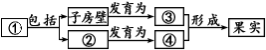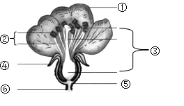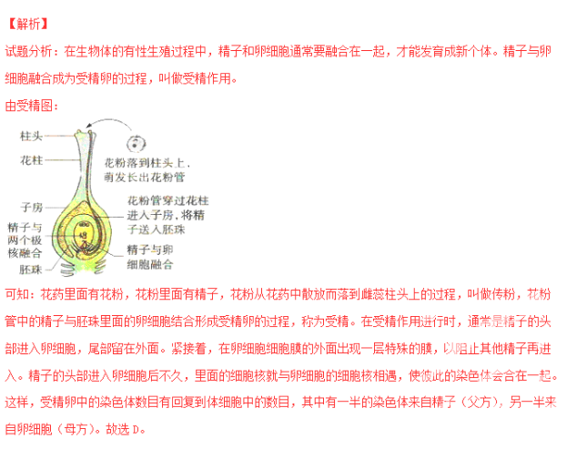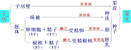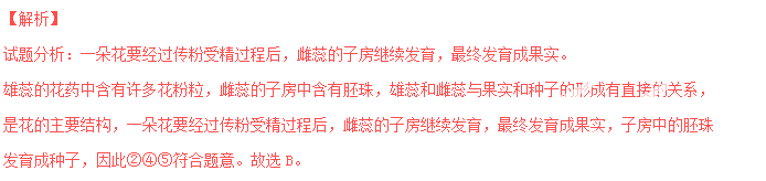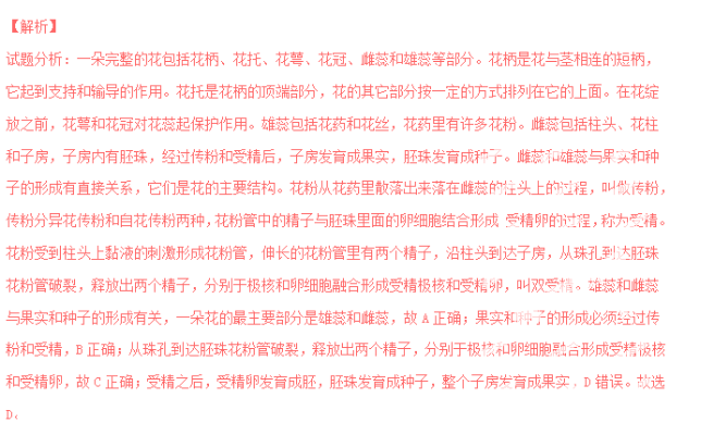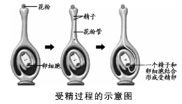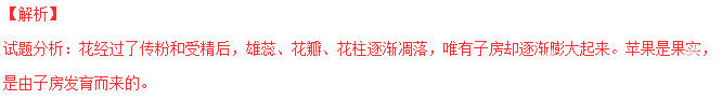 2016年中考生物考點(diǎn)總動(dòng)員系列【專題05】開花和結(jié)果(1) 聚焦考點(diǎn)☆溫習(xí)理解 一、花的結(jié)構(gòu)和功能: 1.花的結(jié)構(gòu)和功能 2.一朵花是由花柄、花托、萼片、花瓣、雄蕊和雌蕊等組成的。 3.花的主要結(jié)構(gòu)是雄蕊和雌蕊,雄蕊花藥里面有花粉,雌蕊下部的子房里有胚珠。 4.無性花,完全花和不完全花 A.無性花:雄、雌蕊兩者都缺,只有花被的花,稱為無性花,又叫中性花。 B.完全花:在一朵花中,花萼、花冠、雄蕊、雌蕊四部分俱全的,叫作完全花。如白菜花、桃花。 C.不完全花:在一朵花中,花萼、花冠、雄蕊、雌蕊四部分缺少其中一至三部分的,叫作不完全花。如南瓜花、黃瓜花缺雄蕊或雌蕊;桑樹花、栗樹花缺花瓣、雄蕊或雌蕊;楊樹花,柳樹花缺萼片、花瓣、雌蕊或雄蕊。 二.開花、傳粉和受精 1.開花:花是由花芽發(fā)育而成的。綠色開花植物都有開花的習(xí)性,但不同的植物開花的時(shí)間和花期有很大差異。如迎春花在早春綻放,梅花在初冬盛開,月季花從初春到深秋可持續(xù)幾個(gè)月的花期。開花主要受外界環(huán)境中光照和溫度的影響。 2.傳粉:花粉從花藥中散放而落到雌蕊柱頭上的過程,叫做傳粉。 A.植物傳粉的兩種類型:自花傳粉(如玉米、水稻、小麥)和異花傳粉。異花傳粉需要有一定的媒介,這種媒介主要是風(fēng)和昆蟲。 B.為了彌補(bǔ)自然狀態(tài)下傳粉的不足,人們常常給植物進(jìn)行人工輔助授粉。 3.受精花粉落到柱頭上以后,在柱頭上黏液的刺激下開始萌發(fā),長出花粉管?;ǚ酃艽┻^花柱,進(jìn)入子房,一直到達(dá)胚珠?;ǚ酃苤械木与S著花粉管的伸長最終進(jìn)入胚珠內(nèi)部。胚珠里面的卵細(xì)胞,與來自花粉管中的精子結(jié)合,形成受精卵的過程,稱為受精。兩個(gè)精子中一個(gè)精子與卵細(xì)胞結(jié)合形成受精卵,另一個(gè)精子與極核融合形成受精極核,叫雙受精,是綠色開花植物特有的受精方式。  三、果實(shí)和種子的形成 受精完成后,花瓣、雄蕊以及柱頭和花柱紛紛凋落,子房繼續(xù)發(fā)育成為果實(shí)。其中子房壁發(fā)育成果皮,子房里面的胚珠發(fā)育成種子,胚珠里面的受精卵發(fā)育成胚。 子房→果實(shí);胚珠→種子;子房壁→果皮;珠被→種皮;受精卵→胚;受精極核→胚乳。 我們平時(shí)吃的蘋果,西瓜等是吃的果肉部分,一個(gè)果實(shí)中有多粒種子決取于子房內(nèi)的胚珠數(shù)目的多少。 名師點(diǎn)睛☆典例分類 類型一:花的結(jié)構(gòu)和功能 【例1】【2014年中考山東省濟(jì)寧市卷】如圖,花中最重要的結(jié)構(gòu)是 A.②③ B.①⑤ C.④⑤ D.①⑥ 【答案】A 【解析】試題分析:⑥花柄連接莖和花;⑤花托上面著生花的各部分;④花萼和①花冠在花開放以前保護(hù)花的內(nèi)部結(jié)構(gòu);花開放后,花冠能夠招引昆蟲來傳粉;②雄蕊有花絲和花藥組成,花絲支持花藥,花藥中有花粉;③雌蕊由柱頭、花柱和子房幾部分,柱頭接受花粉,一朵花的花粉通過一定的方式落到同一朵花的柱頭上的方式,叫自花傳粉,再經(jīng)過受精后,雌蕊的子房將來發(fā)育成果實(shí),子房中的胚珠發(fā)育成種子,可見②雄蕊和③雌蕊是花的主要結(jié)構(gòu)。故選:A 考點(diǎn):花的結(jié)構(gòu)和功能。 【點(diǎn)睛】本題考查花的結(jié)構(gòu)和功能,知道雄蕊和雌蕊是花的主要部分。 類型二:開花、傳粉和受精 【例2】【2015年黃石市初中學(xué)業(yè)水平考試題】綠色開花植物的卵細(xì)胞與精子結(jié)合發(fā)生在( ?。?/div> A.花藥中 B. 花粉管中 C. 花柱中 D. 胚珠中 【答案】D 考點(diǎn):傳粉和受精。 【點(diǎn)睛】本題考查植物的傳粉和授精過程,卵細(xì)胞位于胚珠內(nèi),發(fā)生受精的場所只能是在胚珠內(nèi),精子與卵細(xì)胞結(jié)合形成受精卵。 類型三:果實(shí)和種子的形成 【例3】【2015年中考湖南省衡陽市卷】蘋果花凋謝后不久,結(jié)出了蘋果。發(fā)育成蘋果的是蘋果花中的( ) A.花瓣 8.花藥 C.花柱 D.子房 【答案】D 考點(diǎn):果實(shí)和種子的發(fā)育。 【點(diǎn)睛】【點(diǎn)睛】本題考查花經(jīng)過受精后花的各部分的發(fā)育過程,只有子房繼續(xù)發(fā)育形成果實(shí),子房壁發(fā)育成果皮,胚珠發(fā)育成種子,受精卵發(fā)育成胚,受精極核發(fā)育成胚乳,珠被發(fā)育成種皮?;ǖ钠渌糠值蚵洹?/div> 課時(shí)作業(yè)☆能力提升 一、選擇題 1.【2015年蘭州市初中學(xué)業(yè)水平考試生物試題】百合花是一種常見的觀賞花卉,將其雌蕊用刀切開后觀察,圖示如下,則將來可能發(fā)育成種子的結(jié)構(gòu)是( ) A. ① B. ② C. ③ D. ④ 【答案】A 【解析】 試題分析:一朵完整的花包括花柄、花托、花萼、花冠、雌蕊和雄蕊等部分,圖中①胚珠,②子房,③柱頭,④花柱。 雌蕊由柱頭、花柱和子房三部分組成,一朵完整的花經(jīng)過傳粉和受精后,只有子房繼續(xù)發(fā)育,子房的發(fā)育情況為: 可見,子房發(fā)育成果實(shí),子房壁發(fā)育成果皮,子房內(nèi)的胚珠發(fā)育成種子,受精卵發(fā)育成胚。故選A。 考點(diǎn):果實(shí)和種子的形成。 2.【2015年恩施州初中學(xué)業(yè)水平考試】下列關(guān)于綠色開花植物開花和結(jié)果的敘述錯(cuò)誤的是( ?。?/div> A. 雄蕊和雌蕊是花的主要結(jié)構(gòu) B. 傳份和受精是種