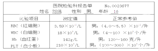 18、張睿的父親感到身體不適,精神不振、疲勞、頭暈,到醫(yī)院檢查后,血常規(guī)化驗結(jié)果如下