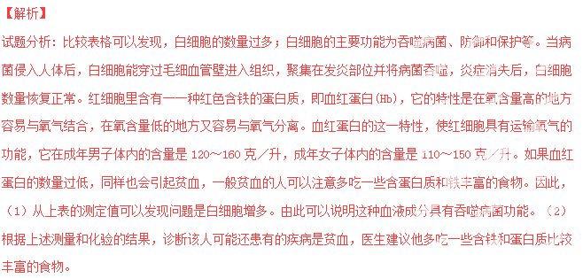 (3)根據(jù)上述測量和化驗的結(jié)果,診斷該人可能患有的疾病是貧血,建議他多吃一些含鐵質(zhì)和蛋白質(zhì)比較豐富的食物。