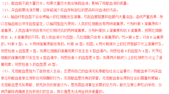 【答案】(1)只有身體健康者的血才能輸給傷員;(2)飲水影響了所獻血液的質(zhì)量;(3)減少采血穿刺部位的感染和血液的污染;(4)輸血應以輸同型血為原則;O型、A型、B型、AB型;(5)面對地震災難,看到人們踴躍獻血,我真正感覺到大災凝聚人心,中國人民萬眾一心,一方有難,八方支援,無論多大的困難都能克服