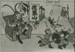 Long long ago, there were Many monkeys lived in Mountain of Flowers and Fruit. They were very happy and free. One day, a pig named Pigsy visited here. The Monkey King pointed at him and shouted:" Get out from my home!" All the monkeys said the same words to him and laughed. At the same time, two of them pushed him without sympathy.