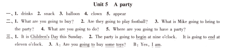 二、1. Children’s Day 2. put on 3. some balloons 4. wearing new clothes 5. have a party 6. 帶上禮物 7. 一個(gè)小丑出現(xiàn)了 8. 玩得開(kāi)心 9. 講個(gè)故事 10. 成為國(guó)王