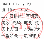 五、用打比方的方法,把下面的句子寫具體。 1. 一片大海 2. 一面碩大的銀鏡 3. 一團火焰 4. 一個個小燈籠