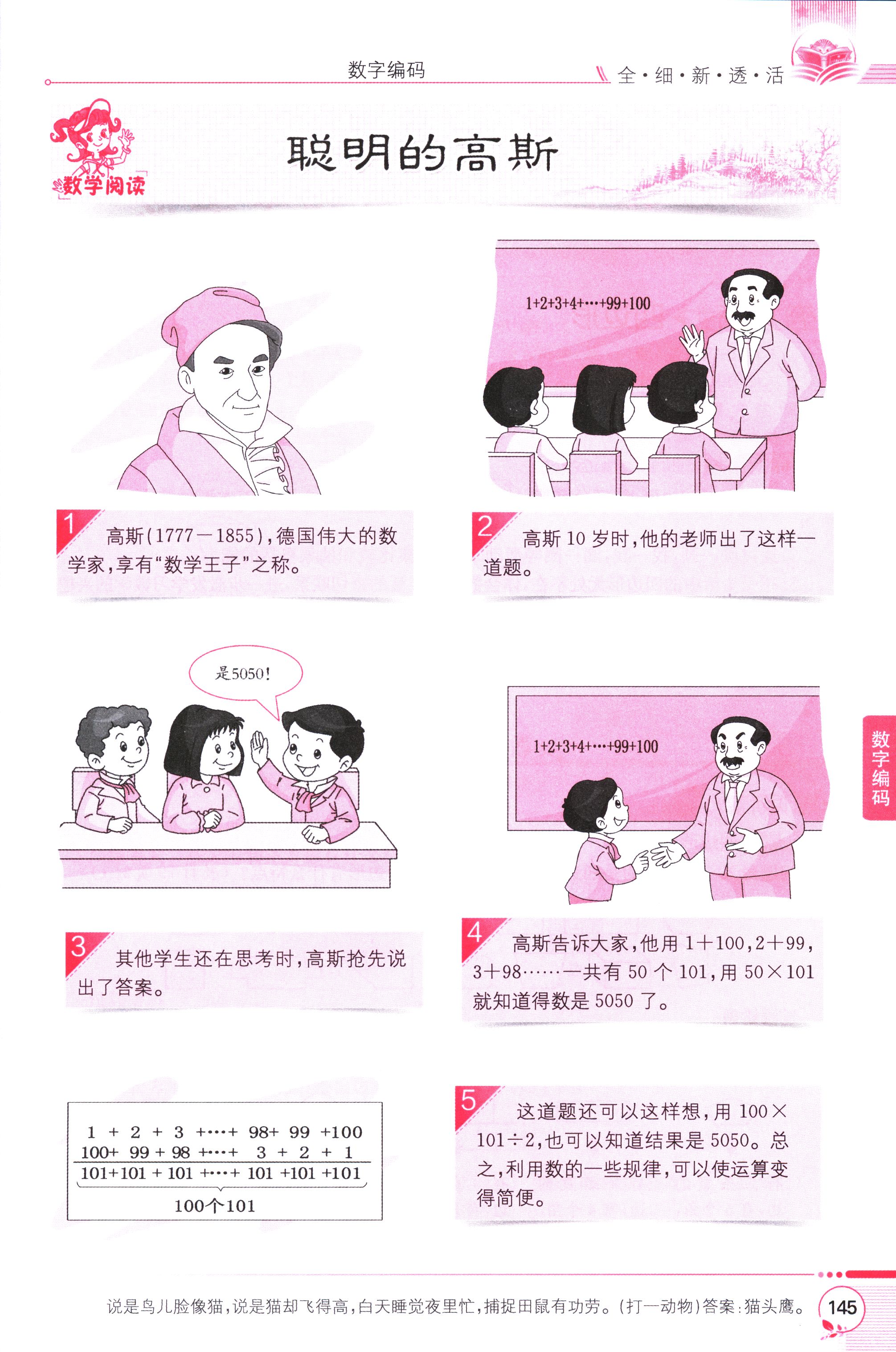 數學課本人教版三年級上 數學閱讀 聰明的高斯