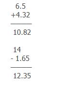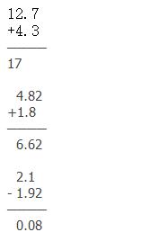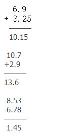 第4單元 小數(shù)加法和減法 第1課時(shí) 1.1 0.41 9.6 0.3 0.88 7.5 1.4 4.3 2.  3. 4. 加數(shù) | 31.2 | 7.12 | 6.45 | 84 | 6.51 | 加數(shù) | -6.7 | 3.44 | 3.25 | 29 | 2.25 | 加數(shù) | 24.5 | 10.56 | 9.7 | 113 | 8.76 |