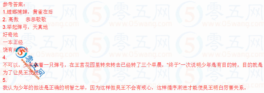 少年終于被吳王發(fā)現(xiàn)了。吳王問道:“你早晨跑到花園里來干什么?看你的衣裳都被露水打濕啦!” 少年回答說:“稟報(bào)大王,我在打鳥?!?/p> 吳王問:“你打著鳥了嗎?” 少年說:“我沒有打著鳥,卻見到一件挺有意思的事?!?/p> 吳王來了興趣,問:“什么事???” 少年說:“花園里有一棵樹,樹上有一只蟬。蟬高高在上,悠閑地叫著,自由自在地喝著露水,卻不知道有只螳螂在它的身后。那螳螂拱著身子,舉起前爪,要去捕蟬,卻不知道有只黃雀在它的身后。