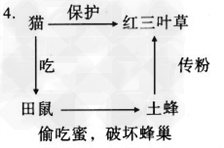 生物學(xué)家達(dá)爾文在英國鄉(xiāng)村曾經(jīng)觀察到這樣一個有趣的事實:凡是貓養(yǎng)得多的地方,那里的紅三葉草就長得特別茂盛。貓和紅三葉草,可以說是風(fēng)馬牛不相及。這究竟是什么道理呢?細(xì)心鉆研的達(dá)爾文終于發(fā)現(xiàn)了這個秘密。原來,紅三葉草是寺門靠土蜂來傳粉的;而土蜂釀的蜜,常常被田鼠偷吃,田鼠還破壞了蜂巢。這樣,田鼠多了,土蜂就少了,紅三葉草傳粉的機(jī)會也少了。鼠的天敵是貓,貓多了,鼠少了,土蜂就多了;紅三葉草傳粉多了,自然就長得繁茂了。 貓和紅三葉草之間,(似乎也許)毫不相干,可是加上土蜂和田鼠兩個環(huán)節(jié),就連成了一根相互連接的鏈條——食物鏈。 自然界存在著數(shù)不清的食物鏈,各個環(huán)節(jié)縱橫交錯,復(fù)雜多樣,蘋被羊吃,羊被虎吞;鼠吃禾谷,貓頭鷹捕鼠……一種植物往往被多種動物所吃:羊吃草,牛、馬也吃草;一種動物往往吃幾種植物:麻雀吃禾谷,也吃蟲子;一種動物常常被多種動物所吃:狼和豹也像虎那樣,吃牛、羊。 俗話說:“大魚吃小魚,小魚吃蝦米,蝦米吃水藻?!苯雍@镞@些更是常見的事兒。 在自然界,各種生物之間,就這樣組成了一條條“食物鏈”。動植物之間這種相互依存、彼此制約的關(guān)系,組成了一個錯綜復(fù)雜的網(wǎng)——生命之網(wǎng)。 1.用“√”選出括號內(nèi)恰當(dāng)?shù)脑~語。 2.用“__________”畫出文中的一句俗語,這句話用來比喻。 ____________________________________________ 3.短文中的“生命之網(wǎng)”指的是( ) A.生命的網(wǎng)。 B.生命像網(wǎng)一樣多。 C.動植物之間相互依存、彼此制約的關(guān)系。 4.用圖示畫出貓和紅三葉草的關(guān)系。 5.想一想,寫出一條你在生活中所發(fā)現(xiàn)的食物鏈。 ___________________________________________________ 參考答案: 1.遼闊√密切√似乎√ 2.大魚吃小魚,小魚吃蝦米,蝦米吃水藻 勢力大的欺壓、并吞勢力小的 3.c