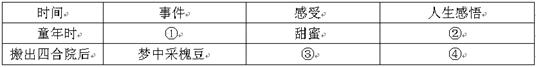 小題1:答案示例:①吃槐花香餅 ②人情美好 ③苦澀 ④生存艱難