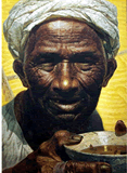 樸;他纏裹的白布頭巾、手捧的粗瓷大碗及碗中的稀飯,又說(shuō)明了他生活的貧困。……