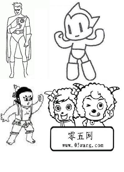 圖中人物分別為超人、阿木童、葫蘆娃、美羊羊和喜羊羊。