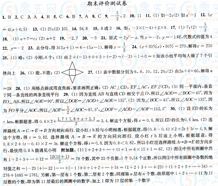 七上數(shù)學(xué)期末評價(jià)測試卷學(xué)習(xí)與評價(jià)答案