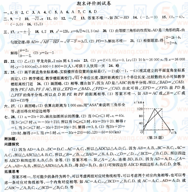 八上數(shù)學(xué)期末評價(jià)測試卷學(xué)習(xí)與評價(jià)答案