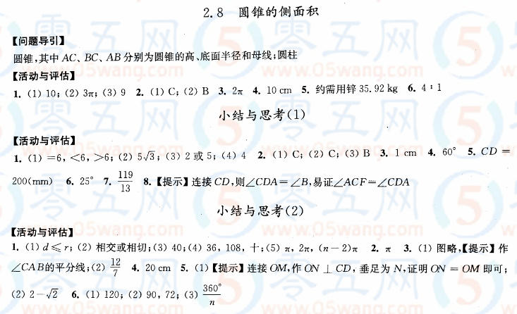 2.8圓錐的側(cè)面積學(xué)習(xí)與評(píng)價(jià)答案
