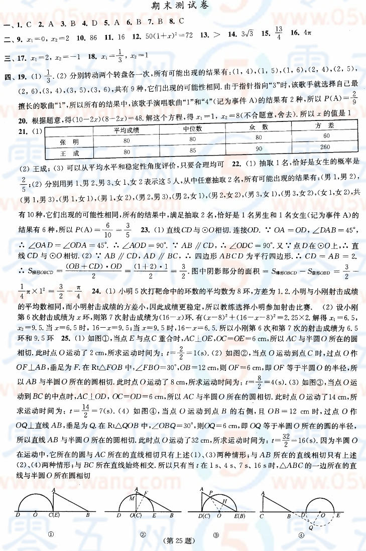 九上數(shù)學(xué)期末測(cè)試卷學(xué)習(xí)與評(píng)價(jià)答案