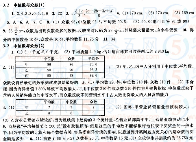 3.2中位數(shù)與眾數(shù)同步練習(xí)答案