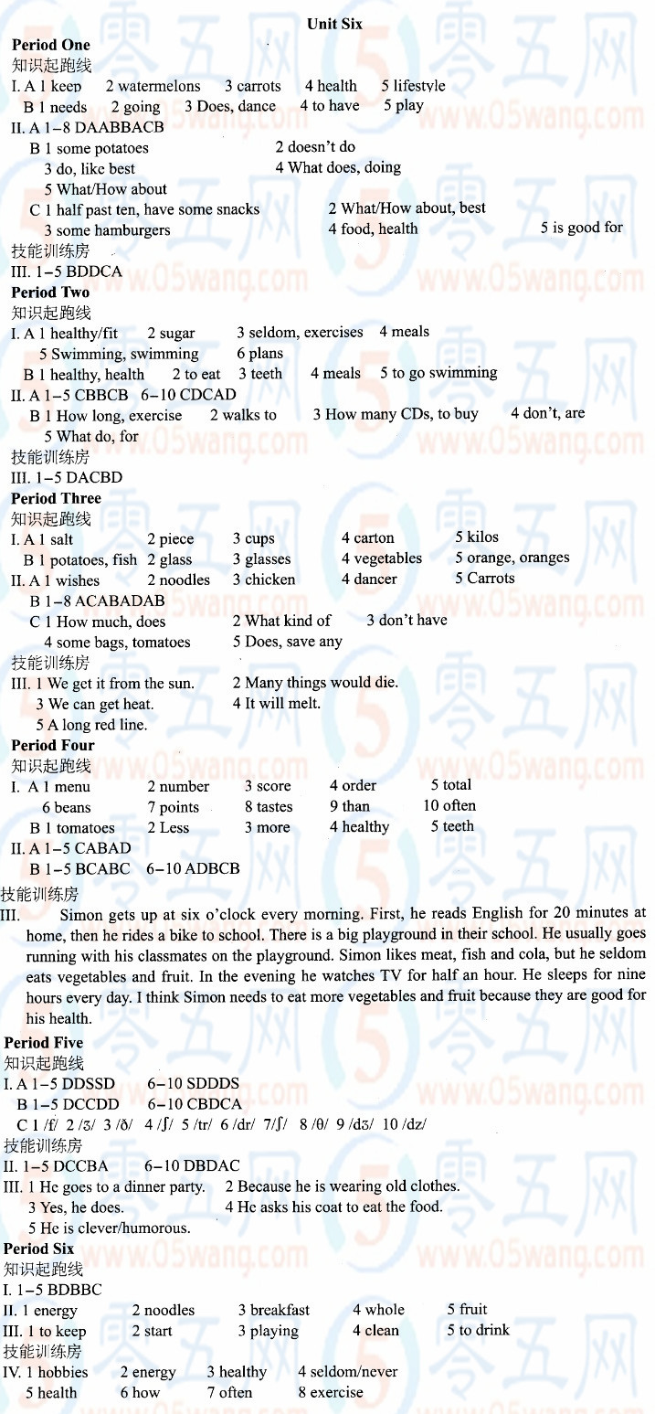 初一七年級上冊英語Unit6 Food and lifestyle學習與評價答案