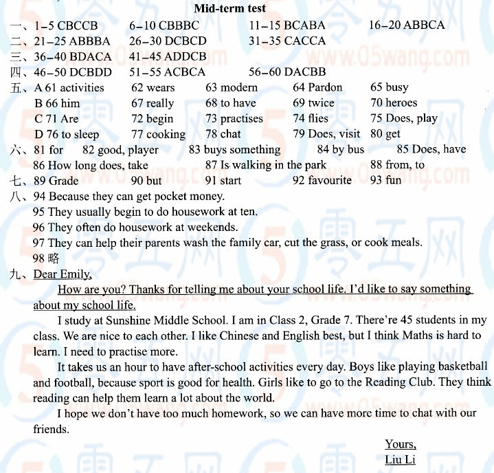初一七年級(jí)上冊(cè)英語(yǔ)Midterm test學(xué)習(xí)與評(píng)價(jià)答案
